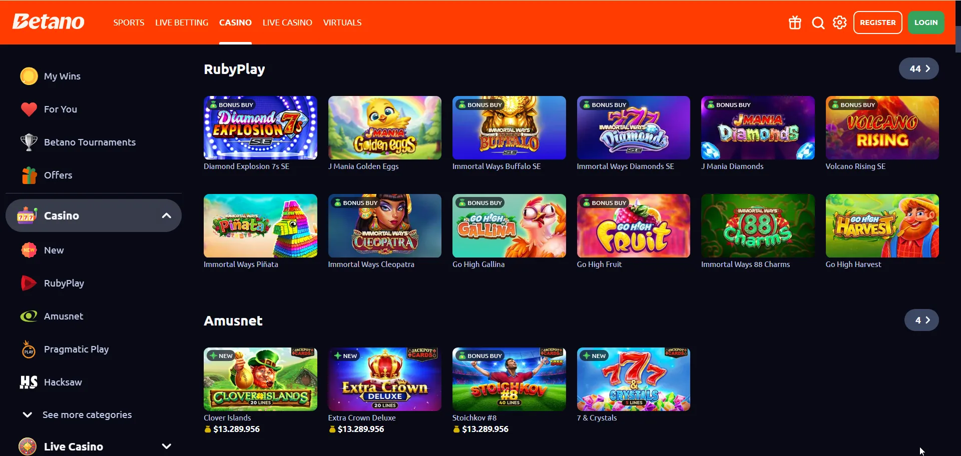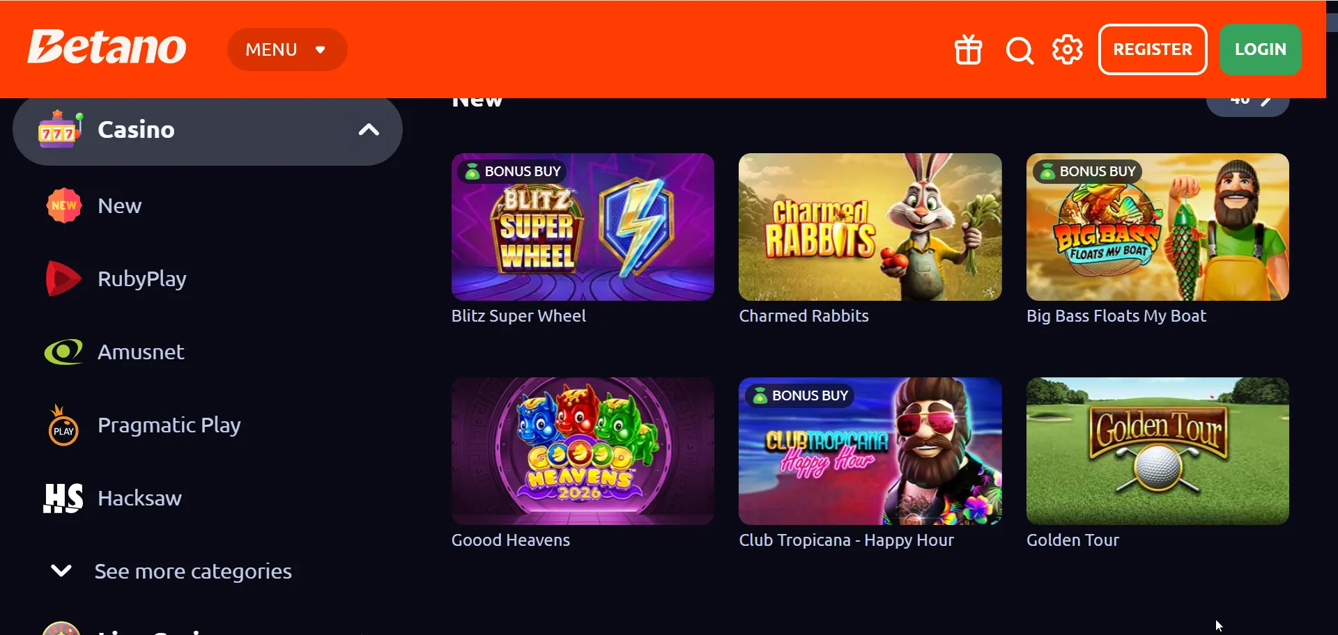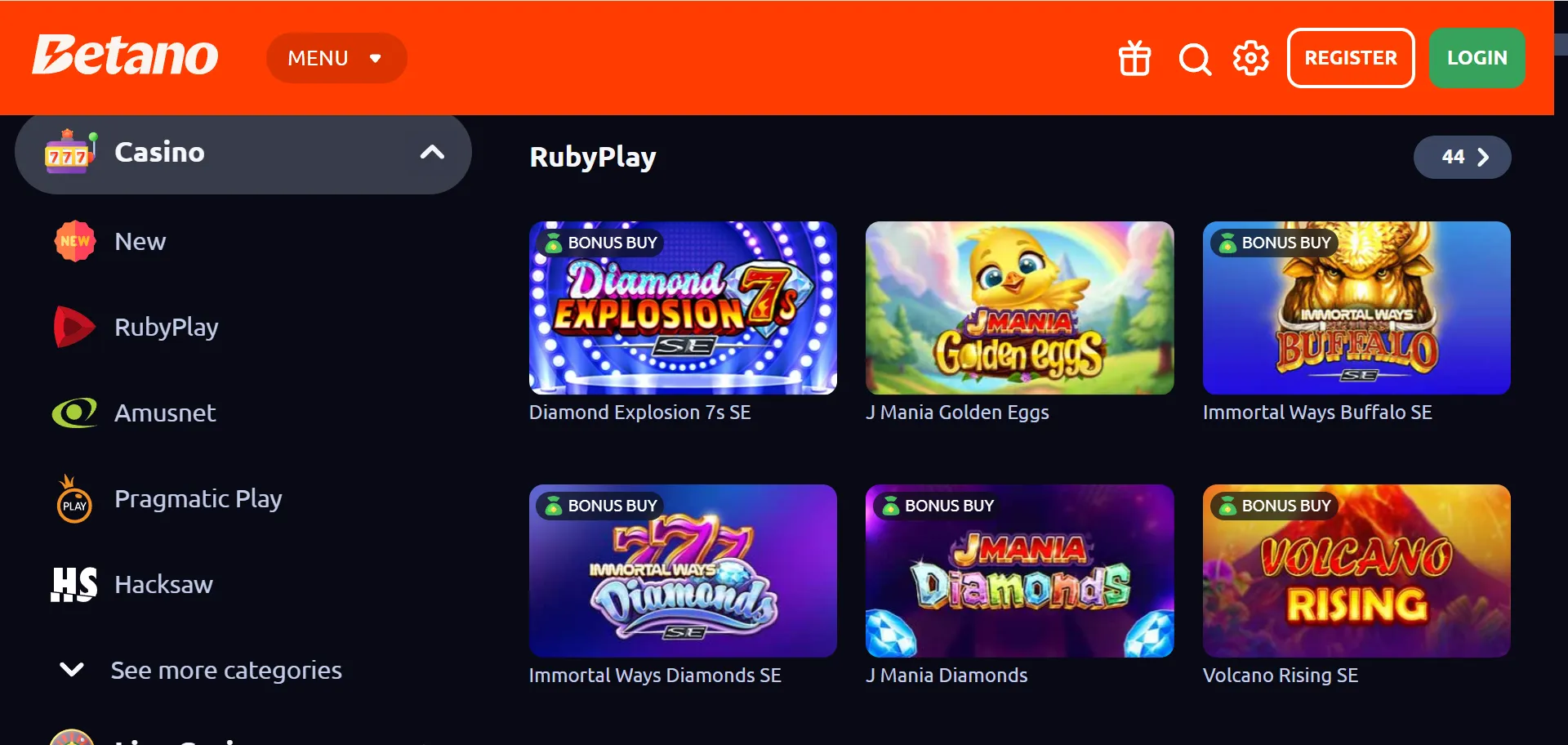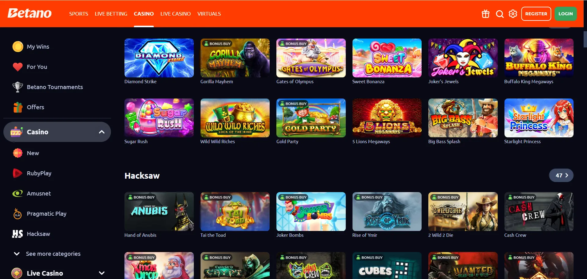 Modo demo: en nuestra prueba, la mayoría de slots ofrecieron versión de práctica después de iniciar sesión; el Casino en Vivo no dispone de demo (estándar del sector). Si el botón “Probar” no aparece, suele deberse a restricciones del proveedor o a mantenimiento.